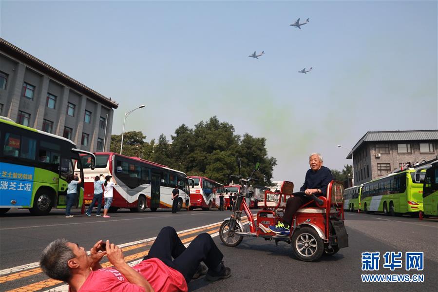10月1日,在北京琉璃廠,當(dāng)受閱飛機(jī)飛過時(shí),北京市民趙先生(左)為92歲的老母親拍照留影。當(dāng)日是國慶節(jié),全國各地的人們用各種方式歡度節(jié)日。新華社記者 薛東梅 攝
