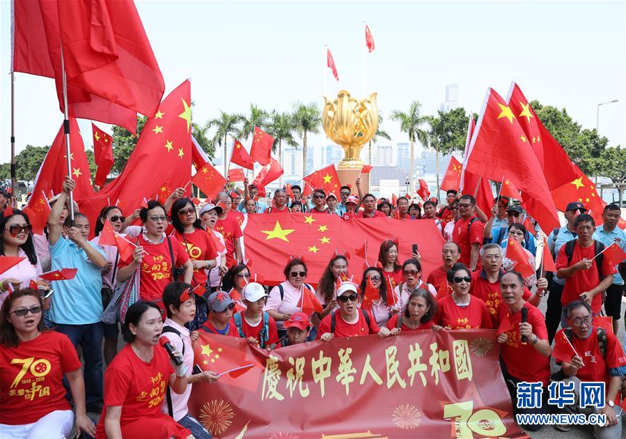 10月1日,香港市民在金紫荊廣場(chǎng)高唱愛國歌曲。當(dāng)日是國慶節(jié),全國各地的人們用各種方式歡度節(jié)日。新華社記者 吳曉初 攝