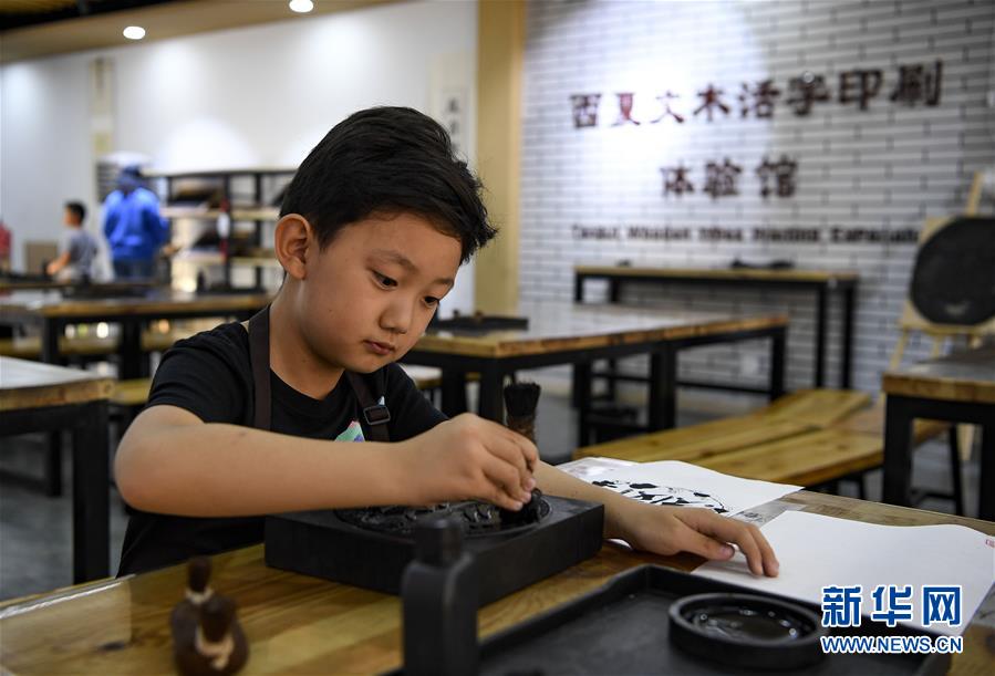 10月2日,游客在寧夏銀川市西夏陵景區(qū)體驗(yàn)西夏文木活字印刷。 新華社記者 馮開(kāi)華 攝