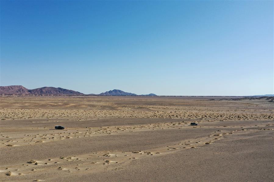 9月25日,內蒙古自治區(qū)額濟納旗算井子邊境派出所的民警開車對轄區(qū)進行巡護(無人機拍攝)。新華社記者劉磊攝