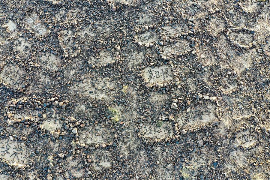 這是內(nèi)蒙古自治區(qū)額濟(jì)納旗算井子邊境派出所民警在大紅山上用石塊擺成的姓名和各種字樣(9月27日無(wú)人機(jī)拍攝)。新華社記者劉磊攝