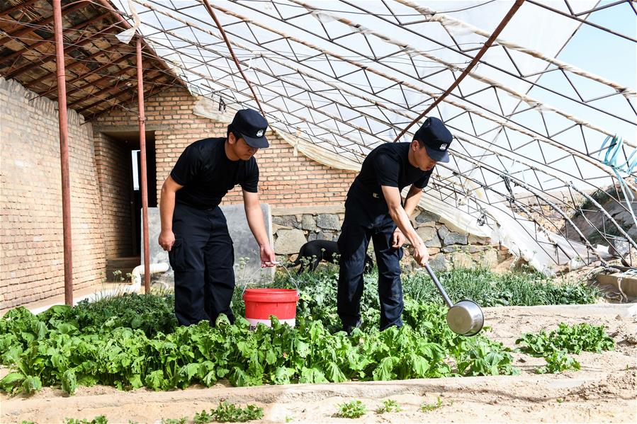 9月27日,內(nèi)蒙古自治區(qū)額濟(jì)納旗算井子邊境派出所民警崔現(xiàn)浦(右)和阿拉塔納在派出所大棚里給蔬菜澆水。新華社記者劉磊攝