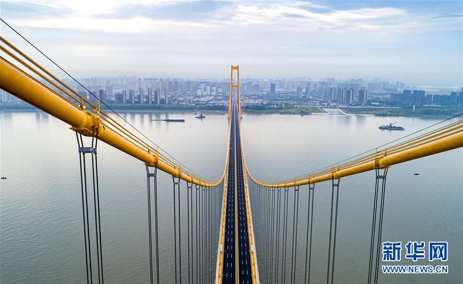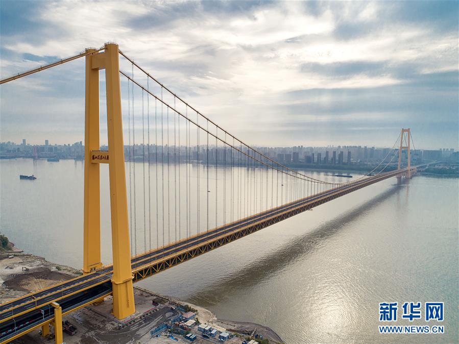 楊泗港大橋建設(shè)創(chuàng)造了多項(xiàng)世界之最:一是主橋跨度達(dá)1700米,為世界上跨度最大的雙層懸索橋;二是主橋設(shè)置雙層雙向12車道,是世界上通行能力最大的公路橋梁;三是大橋主纜設(shè)計(jì)張力6.5萬噸,采用了世界上強(qiáng)度等級(jí)最高的主纜鋼絲;四是大橋設(shè)置機(jī)動(dòng)車道、非機(jī)動(dòng)車道、人行觀光道,集過江交通與觀光于一體,是長江上功能最完備的橋梁。新華社記者熊琦攝
