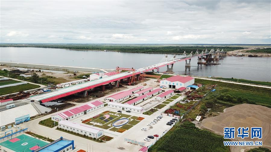 正在進(jìn)行橋面鋪裝施工作業(yè)的黑河到布拉戈維申斯克黑龍江(阿穆?tīng)柡樱┐髽颍?月19日無(wú)人機(jī)拍攝)。新華社記者 王建威 攝