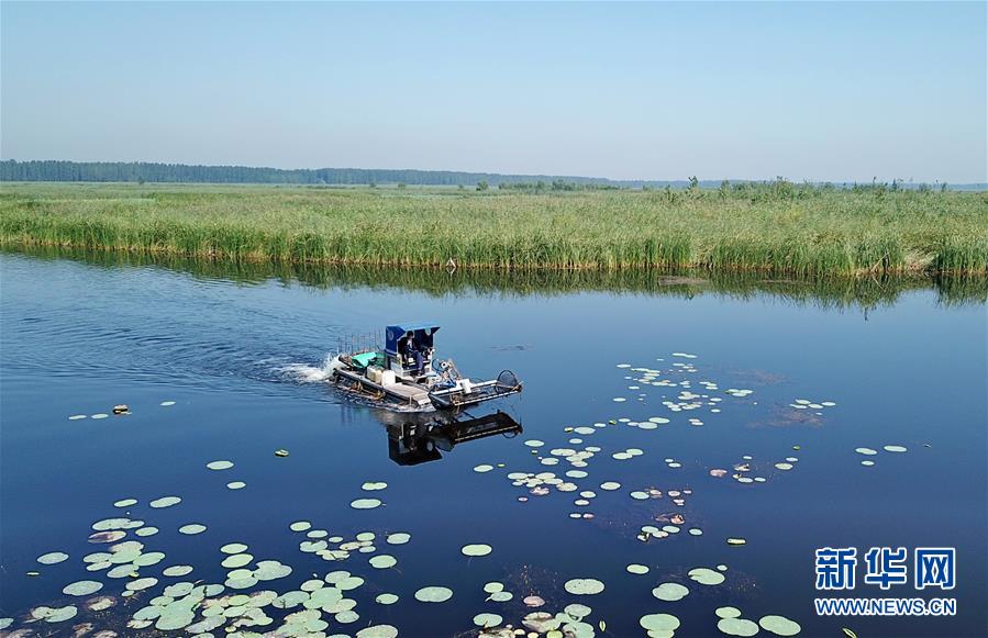 一艘打撈船在白洋淀景區(qū)內(nèi)清理漂浮物(8月31日無人機拍攝)。新華社記者牟宇攝