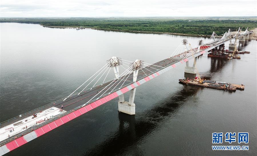 正在進行橋面鋪裝施工作業(yè)的黑河到布拉戈維申斯克黑龍江(阿穆爾河)大橋(8月19日無人機拍攝)。新華社記者王建威攝