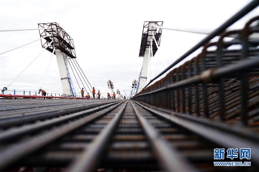 工人在大橋上進行橋面鋪裝施工作業(yè)(8月19日攝)。新華社記者王建威攝