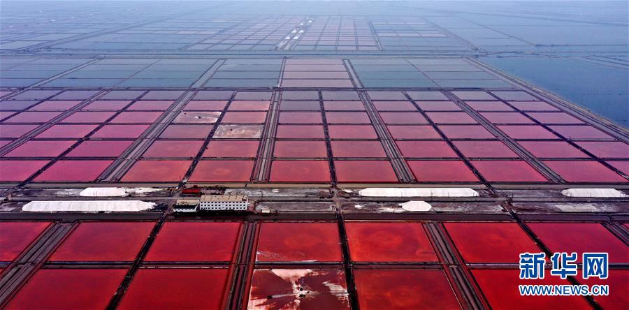 這是進入收獲季節(jié)的魯北鹽場(10月9日無人機拍攝)。新華社記者 朱崢 攝