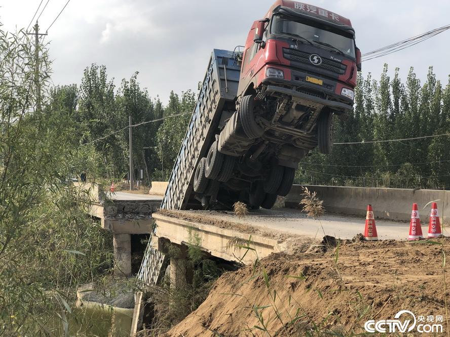 央視網(wǎng)消息:2019年10月13日,山東濱州,一輛滿載貨物的大貨車路過當(dāng)?shù)匾蛔鶎?米左右的小橋時,致使橋面坍塌。據(jù)報道,13日凌晨4點左右,一輛重型半掛貨車沿渤海十八路由南向北行駛至市西辦事處李茂家村附近,右轉(zhuǎn)彎進入連接渤海十八路與李茂家村村西鄉(xiāng)間路的一座寬4米左右的小橋時,致使橋面坍塌?,F(xiàn)場貨車呈翹起之勢,車頭懸于半空中,車尾插入水中,事故未造成人員傷亡。據(jù)現(xiàn)場了解,該橋建設(shè)于1974年,橋頭有警示標識,警示承載4噸。目前救援工作正在緊張有序地進行中。視覺中國