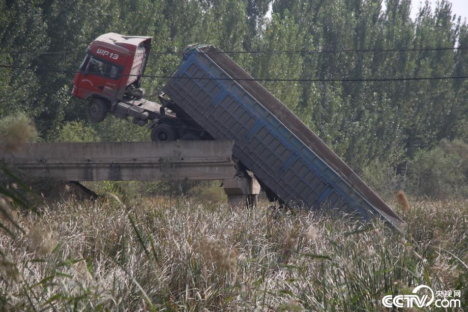 央視網(wǎng)消息:2019年10月13日,山東濱州,一輛滿載貨物的大貨車路過當(dāng)?shù)匾蛔鶎?米左右的小橋時(shí),致使橋面坍塌。據(jù)報(bào)道,13日凌晨4點(diǎn)左右,一輛重型半掛貨車沿渤海十八路由南向北行駛至市西辦事處李茂家村附近,右轉(zhuǎn)彎進(jìn)入連接渤海十八路與李茂家村村西鄉(xiāng)間路的一座寬4米左右的小橋時(shí),致使橋面坍塌?,F(xiàn)場(chǎng)貨車呈翹起之勢(shì),車頭懸于半空中,車尾插入水中,事故未造成人員傷亡。據(jù)現(xiàn)場(chǎng)了解,該橋建設(shè)于1974年,橋頭有警示標(biāo)識(shí),警示承載4噸。目前救援工作正在緊張有序地進(jìn)行中。視覺中國(guó)