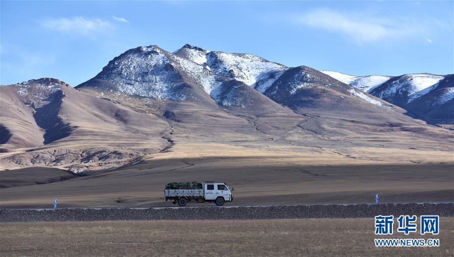西藏那曲市申扎縣境內(nèi),一輛卡車從山前駛過(10月12日攝)。 深秋時節(jié)的藏北,最低氣溫已降至零攝氏度以下,呈現(xiàn)出蒼涼和壯美交織的獨(dú)特景觀。 新華社記者 周錦帥 攝