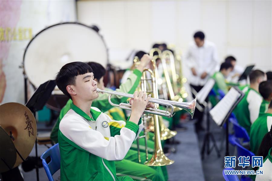 重慶市特殊教育中心排練廳,學(xué)生在排練開始前練習(xí)小號(10月9日攝)。 新華社記者 劉潺 攝