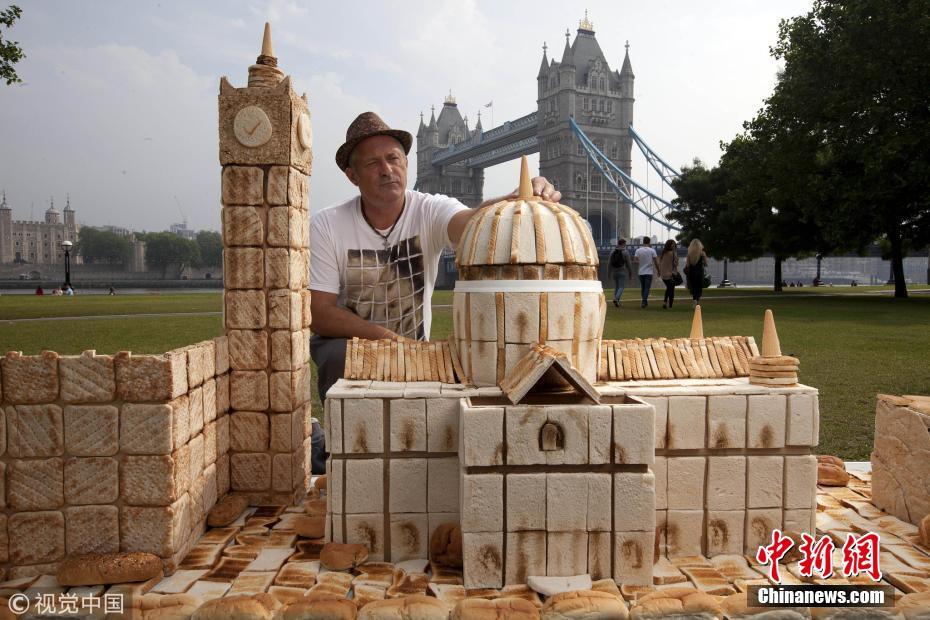 藝術(shù)家用面包等烘焙食品打造微縮倫敦地標建筑。圖片來源:視覺中國