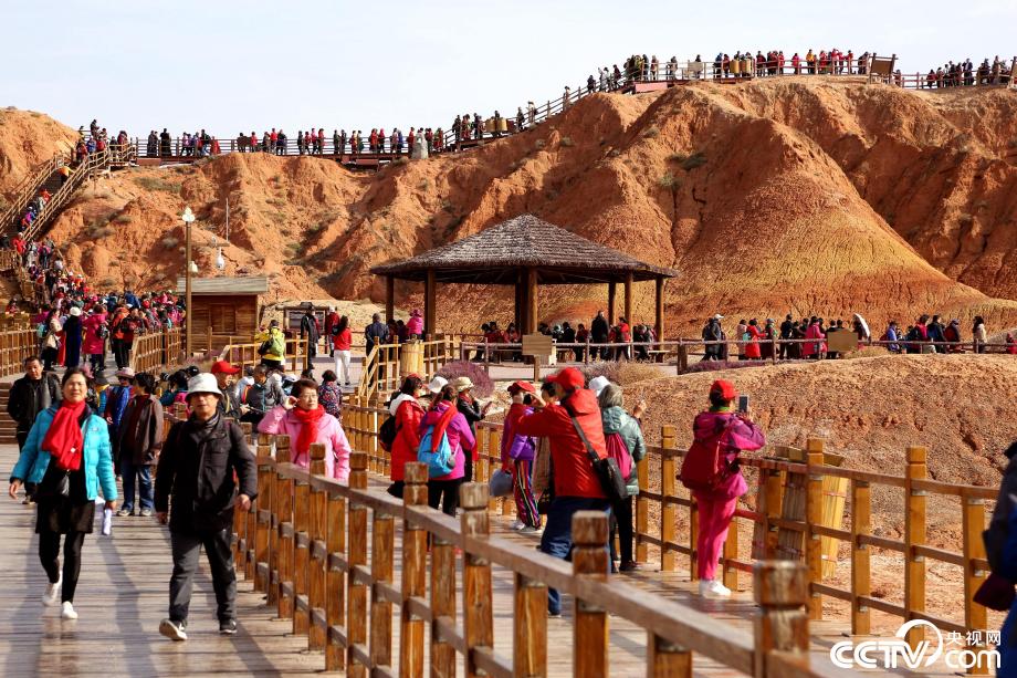 央視網(wǎng)消息:2019年10月15日,金秋時(shí)節(jié),位于甘肅省張掖市臨澤縣的七彩丹霞景區(qū)進(jìn)入旅游旺季,吸引眾多游人紛至沓來。張掖七彩丹霞景區(qū),分布面積約50公里,是中國北方干旱地區(qū)發(fā)育最典型的丹霞地貌。在方圓數(shù)十平方公里的范圍內(nèi),隨處可見有紅、黃、橙、綠、白等多種鮮艷的色塊或線條,把一座座山峰,一條條溝壑,裝點(diǎn)成一幅幅絢麗多姿、燦爛奪目的畫圖。圖片來源:視覺中國