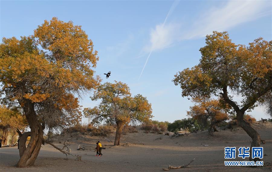 10月16日,游客在內(nèi)蒙古自治區(qū)額濟納旗的胡楊林游覽。新華社記者丁洪法攝