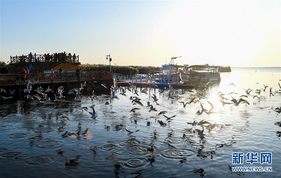 10月17日,游客在居延海岸邊的木棧道上給水鳥喂食。 新華社記者 彭源 攝