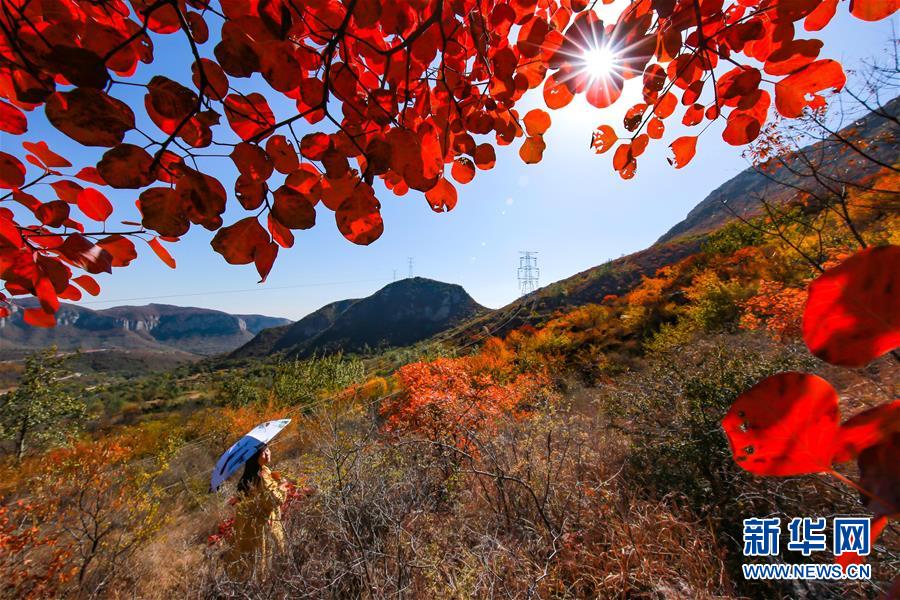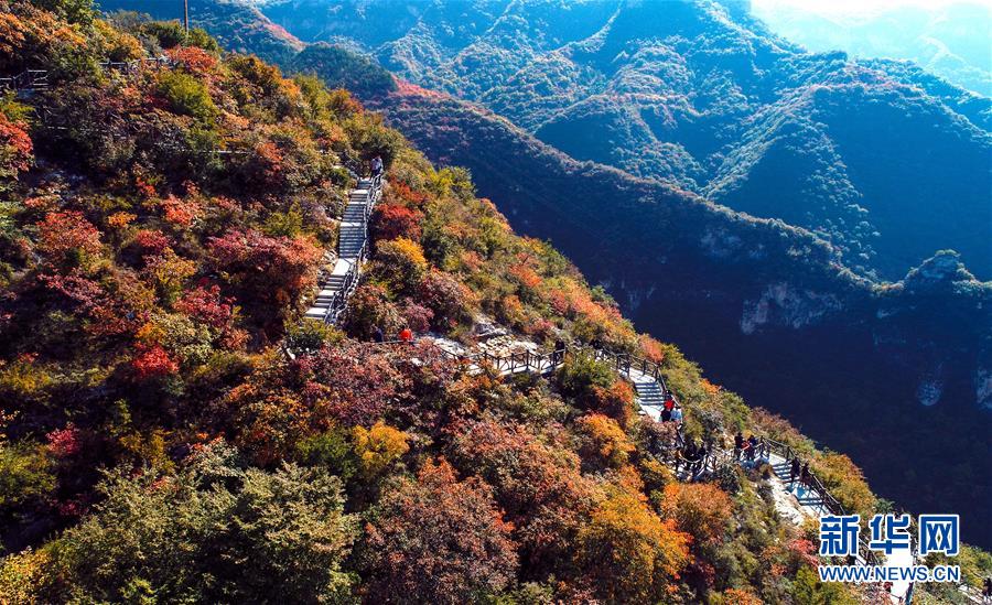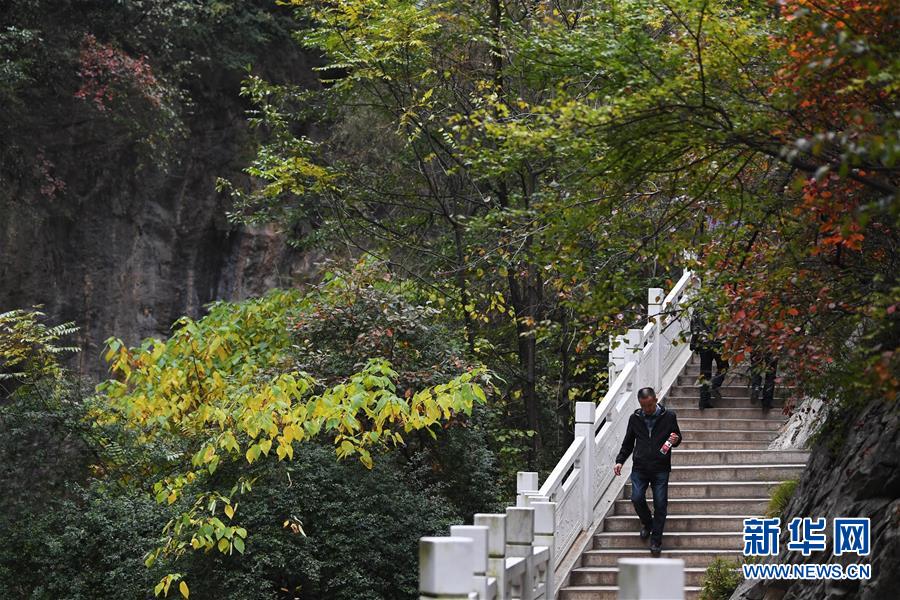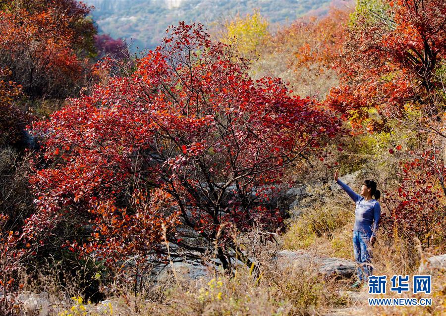 10月24日,游客在河北省武安市賀進鎮(zhèn)后臨河村觀賞紅葉。新華社記者王曉攝