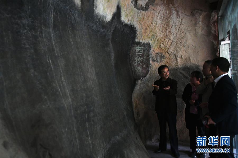 10月16日,成縣文物保護專家張建文(左一)向客人講解漢代摩崖石刻《西狹頌》。新華社記者陳斌攝