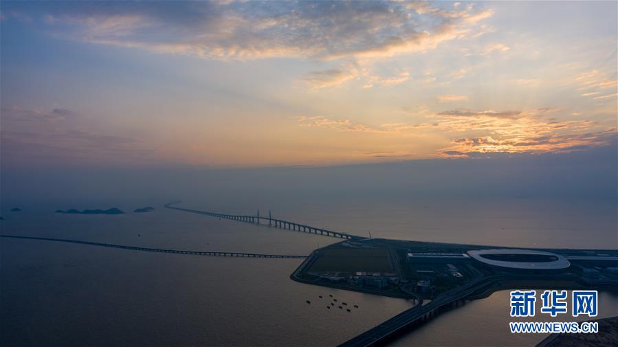 晨曦中的港珠澳大橋珠澳口岸人工島(10月24日無人機拍攝)。2018年10月23日,港珠澳大橋正式開通。在這座圓夢橋、同心橋、自信橋、復(fù)興橋開通一周年之際,記者親自體驗“一橋連三地、一日游三城”的悠閑與便利,于不同的旖旎風(fēng)光中自在游覽,在不同的城市風(fēng)貌間自如切換。新華社記者張金加攝