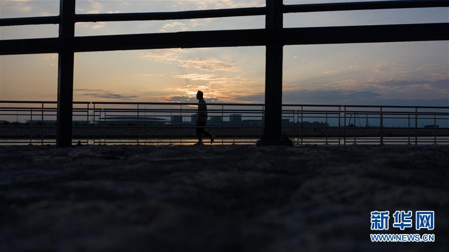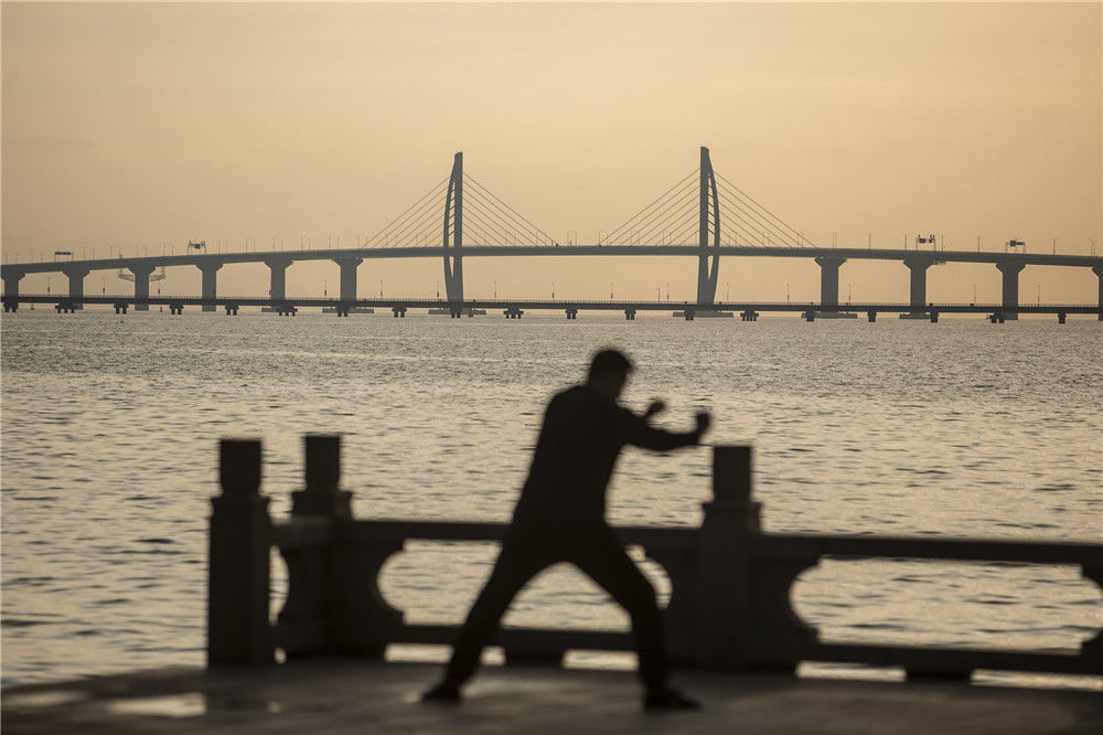 10月24日,晨起的澳門(mén)市民在海邊跑步。2018年10月23日,港珠澳大橋正式開(kāi)通。新華社記者張金加攝
