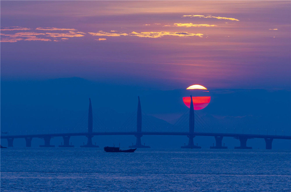 2018年10月22日早晨,從廣東珠海市的情侶路向東眺望,一輪紅日從東方冉冉升起,將港珠澳大橋映射得格外迷人。“超級(jí)工程”港珠澳大橋?qū)⒂?4日上午9時(shí)正式通車(chē)。張煒(香港分社)/中新社/視覺(jué)中國(guó)