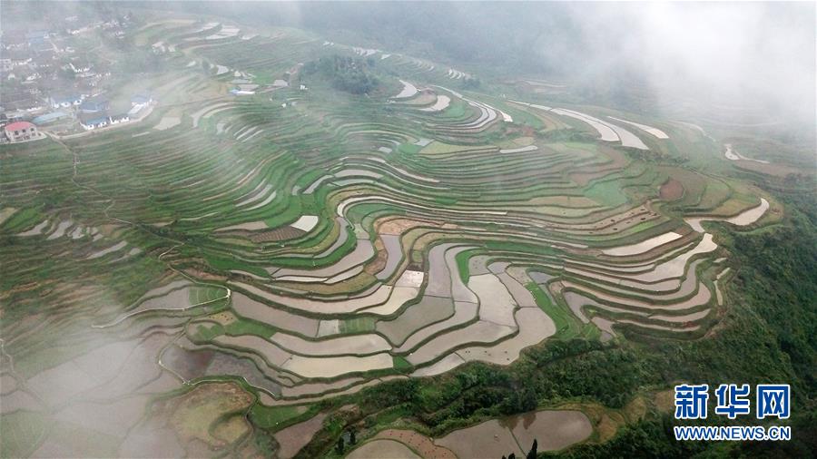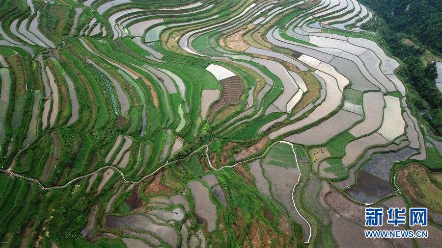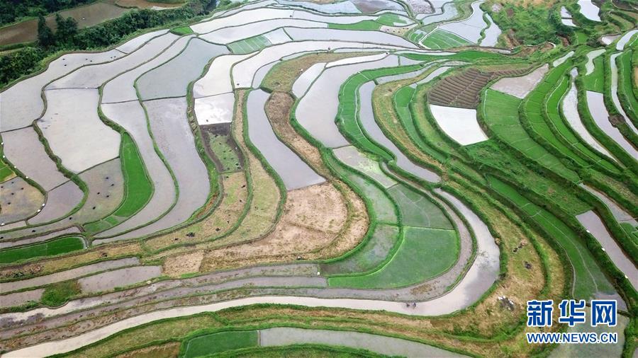 5月18日,農(nóng)民在貴州省丹寨縣龍泉鎮(zhèn)高要梯田里耕作(無人機(jī)拍攝)。初夏時(shí)節(jié),位于貴州省丹寨縣龍泉鎮(zhèn)的高要梯田景色優(yōu)美。新華社記者楊文斌攝