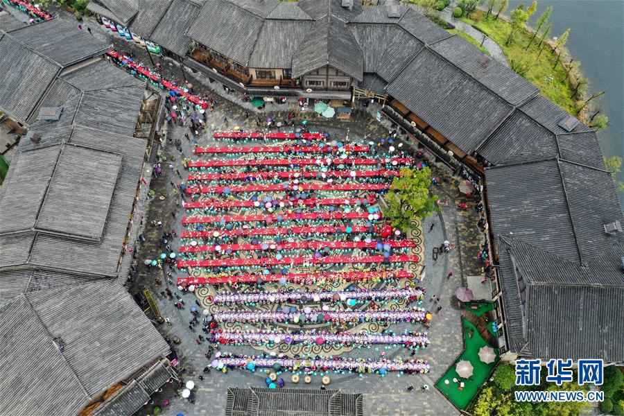 丹寨縣萬達(dá)小鎮(zhèn)“萬人長桌宴”(10月26日無人機(jī)拍攝)。新華社記者歐東衢攝