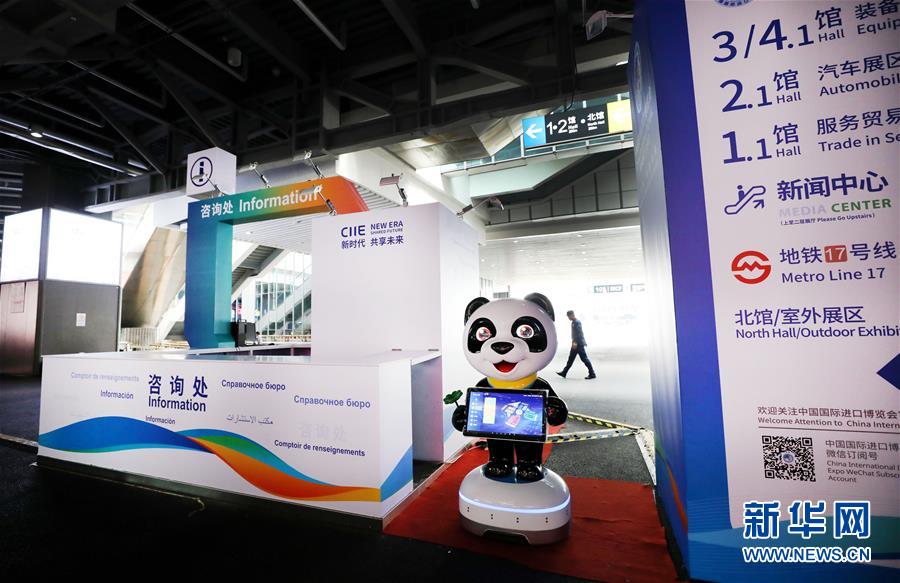 10月25日,位于國展中心內(nèi)的國家會議中心入口處張貼了醒目的進博會吉祥物熊貓進寶裝飾。  新華社記者 方喆攝