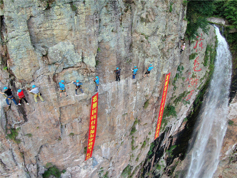 2019年6月28日,浙江寧波,游客在體驗(yàn)“懸崖鋼索棧道”項(xiàng)目。張培堅(jiān)/視覺中國(guó)