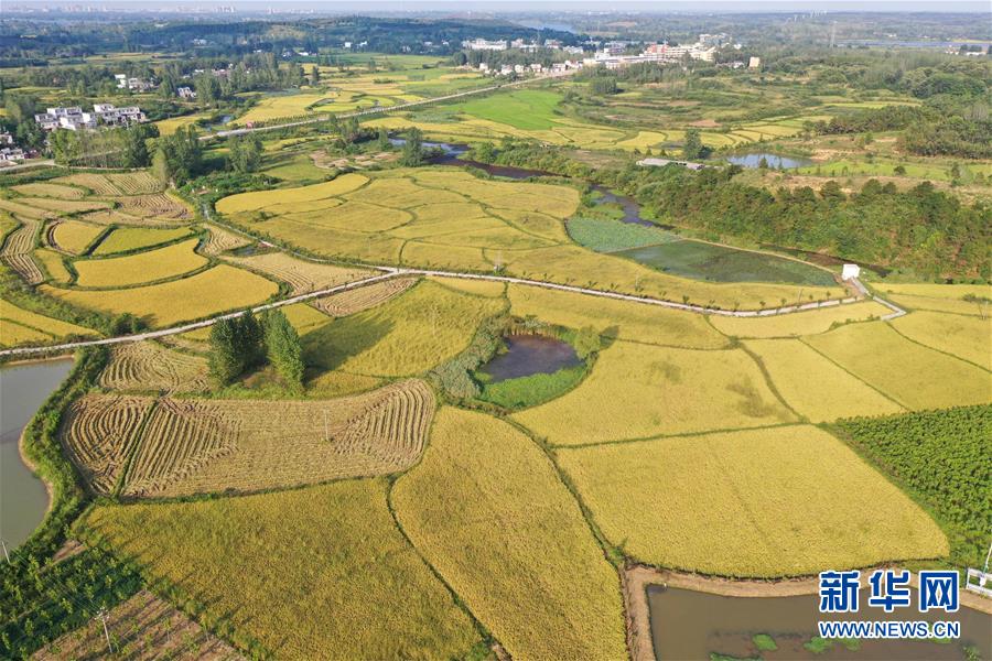 河南省信陽(yáng)市光山縣文殊鄉(xiāng)東岳村的稻田(9月4日無(wú)人機(jī)拍攝)。新華社記者馮大鵬攝