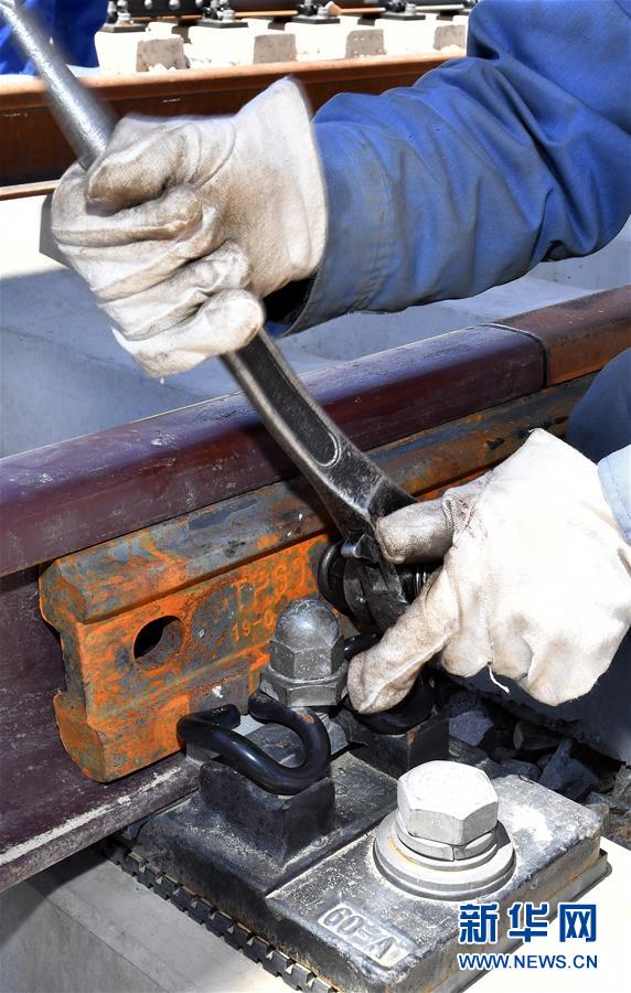 6月6日,負(fù)責(zé)鋪軌的中鐵十一局集團的建設(shè)者在現(xiàn)場作業(yè)。新華社記者覺果攝