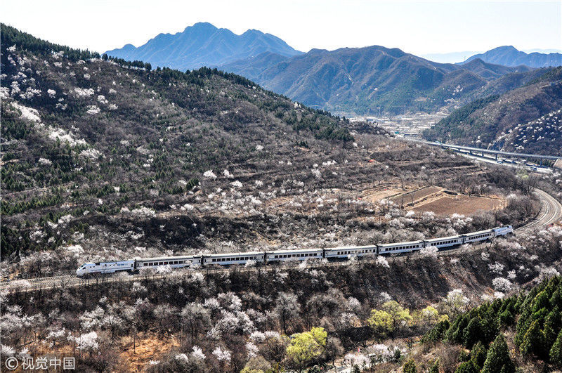 2019年3月22日,北京居庸關(guān)附近的山花盛開,S2線列車穿行在花海之中,構(gòu)成一幅美麗的畫面。時(shí)永平/千龍圖像/視覺中國編輯/陳進(jìn)