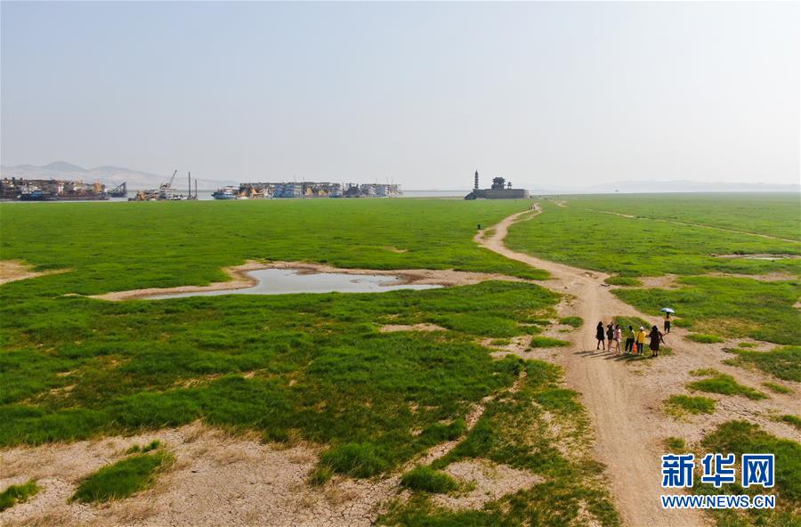 10月9日,江西省廬山市,游客行走在鄱陽湖湖區(qū)干涸的湖面上(無人機(jī)拍攝)。新華社記者胡晨歡攝