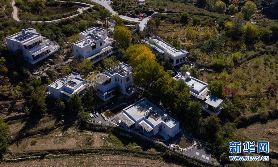 10月29日,四川省鄉(xiāng)城縣的定曲河峽谷的青德鄉(xiāng),民宿“皈院”保留了白藏房傳統(tǒng)民居特色(無人機拍攝)。新華社記者江宏景攝