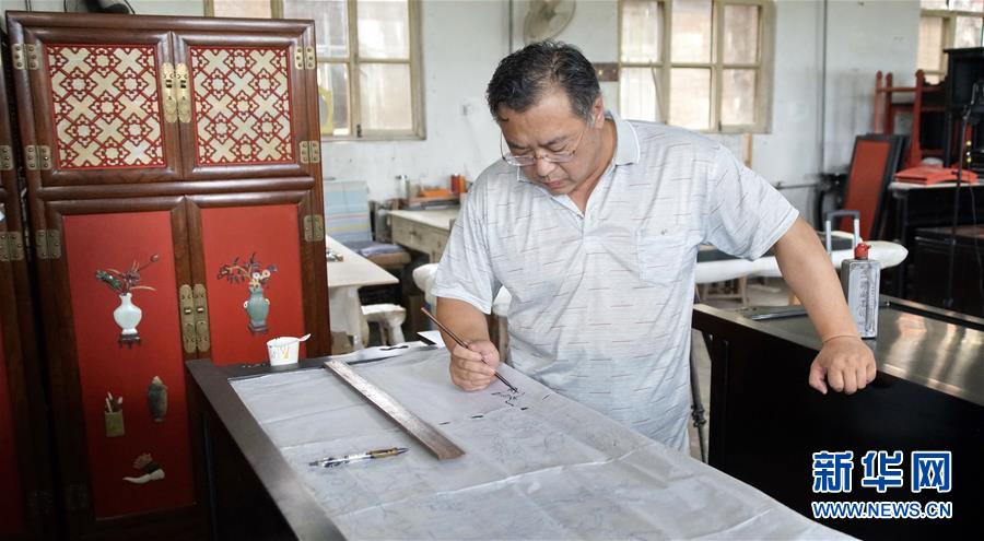 北京金漆鑲嵌有限責(zé)任公司工藝美術(shù)大師王學(xué)兵在繪制漆畫的底圖(10月31日攝)。新華社記者李欣攝