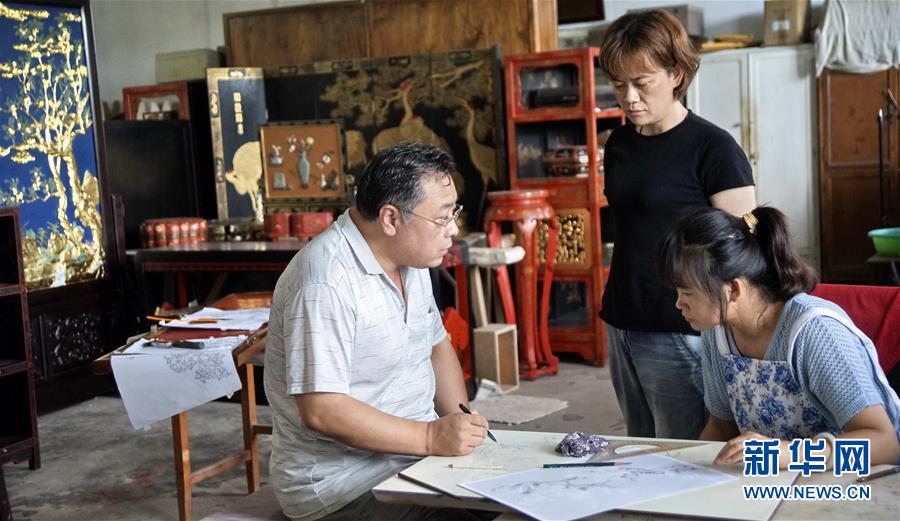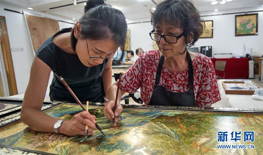 北京金漆鑲嵌有限責(zé)任公司工藝美術(shù)大師胡昕(右)在向?qū)W生傳授漆畫技藝(9月19日攝)。新華社記者李欣攝