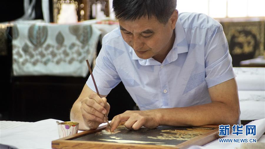 北京金漆鑲嵌有限責(zé)任公司工藝美術(shù)大師胡昕在創(chuàng)作漆畫屏風(fēng)(9月19日攝)。新華社記者李欣攝