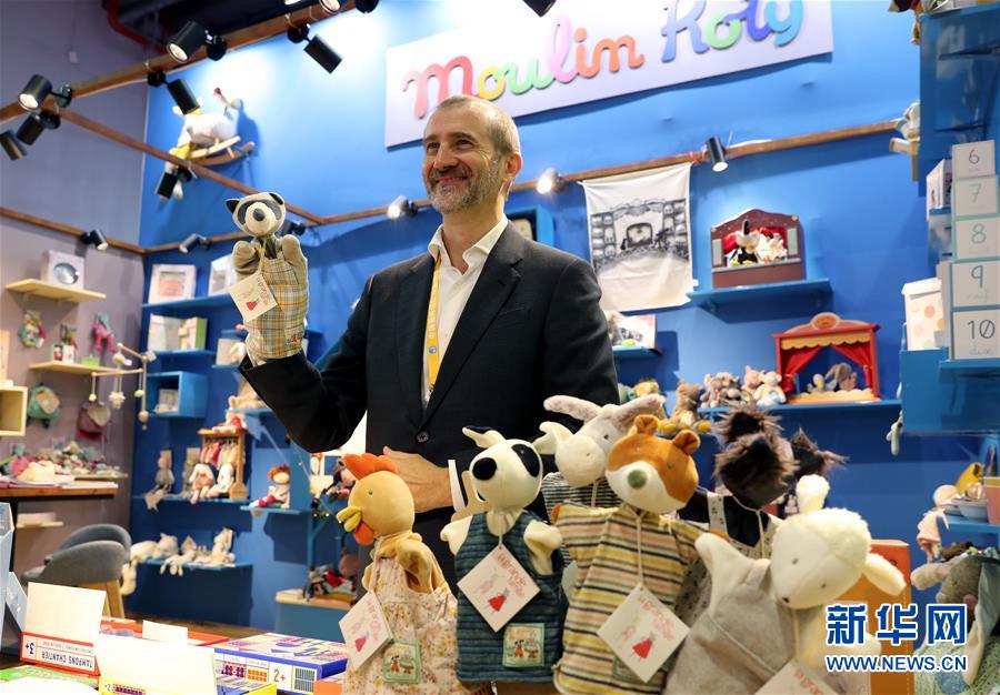 11月5日,在第二屆進(jìn)博會(huì)品質(zhì)生活展區(qū),來(lái)自法國(guó)的玩具品牌展商手持兒童手偶玩具。新華社記者劉穎攝