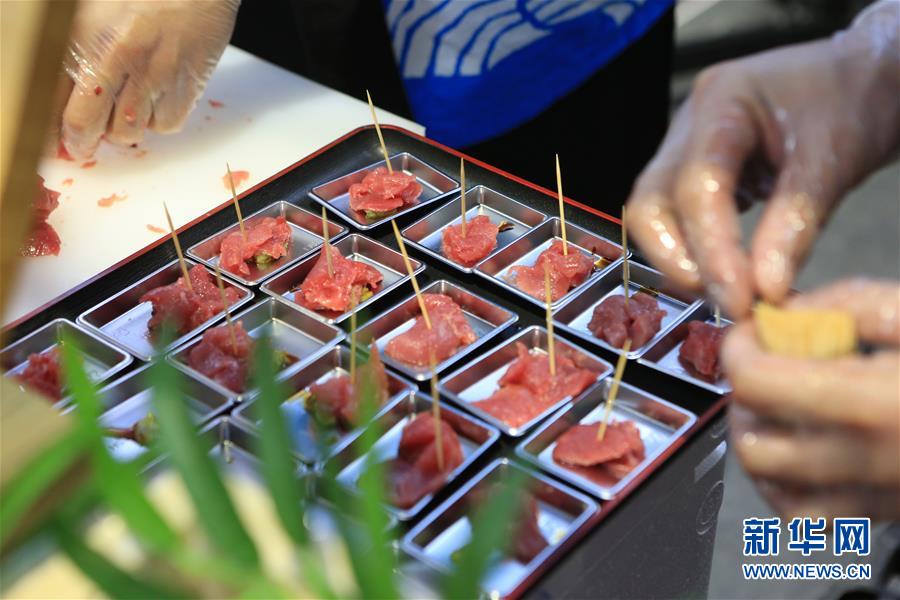 11月7日,切魚(yú)師傅為參觀者準(zhǔn)備用于品嘗的藍(lán)鰭金槍魚(yú)魚(yú)肉。第二屆中國(guó)國(guó)際進(jìn)口博覽會(huì)正在上海國(guó)家會(huì)展中心舉行。博覽會(huì)的食品及農(nóng)產(chǎn)品展區(qū)里匯集了來(lái)自世界各地的美食,同時(shí)也上演各種精彩美食秀。11月7日,來(lái)自日本長(zhǎng)崎魚(yú)市株式會(huì)社的專(zhuān)業(yè)切魚(yú)師傅現(xiàn)場(chǎng)解體一條70公斤的藍(lán)鰭金槍魚(yú),吸引大量參觀者觀看、品嘗。新華社記者隋先凱攝
