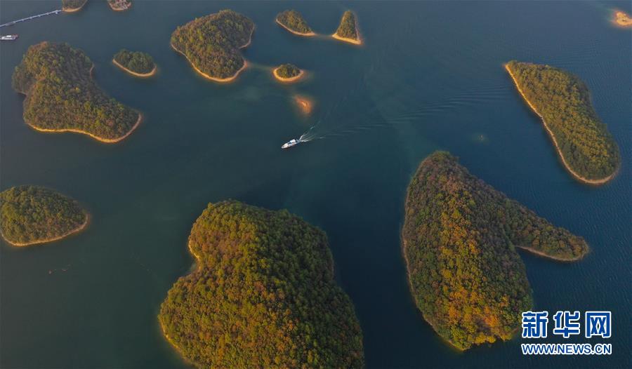11月9日無(wú)人機(jī)拍攝的廬山西海。 當(dāng)日,落日余暉下的江西廬山西海山青水藍(lán),美不勝收。 新華社記者 周密 攝
