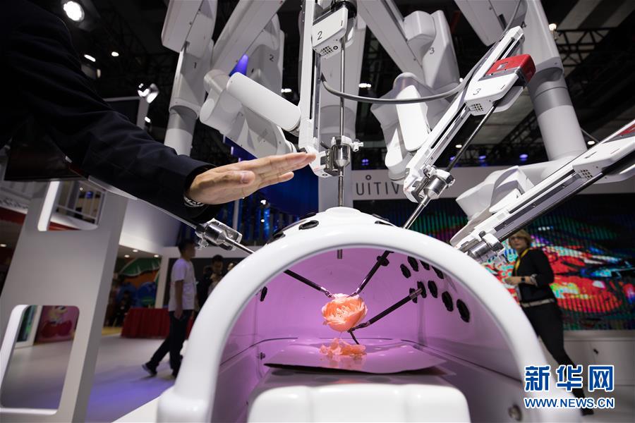 這是在第二屆進(jìn)博會(huì)醫(yī)療器械及醫(yī)藥保健展區(qū)拍攝的機(jī)器人輔助腹腔鏡手術(shù)系統(tǒng)(11月7日攝)。新華社記者金立旺攝