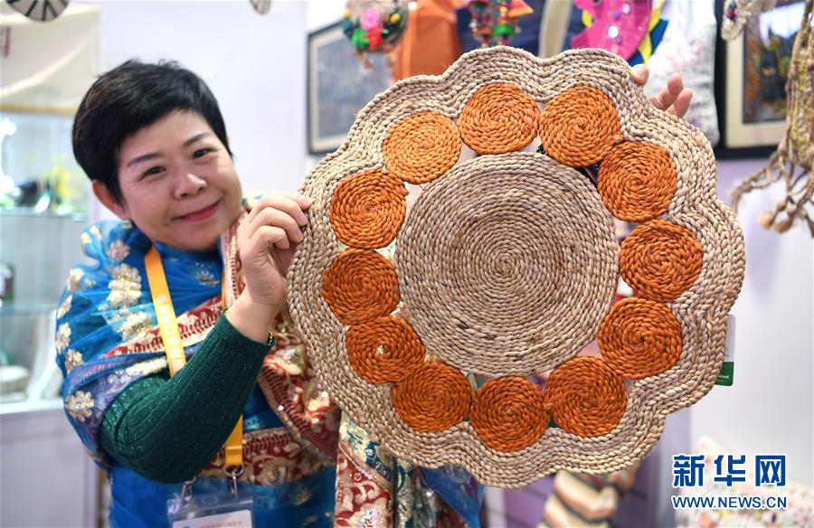 在第二屆進(jìn)博會(huì)品質(zhì)生活展區(qū),孟加拉國(guó)達(dá)達(dá)公司工作人員展示黃麻制品(11月8日攝)。新華社記者范培珅攝