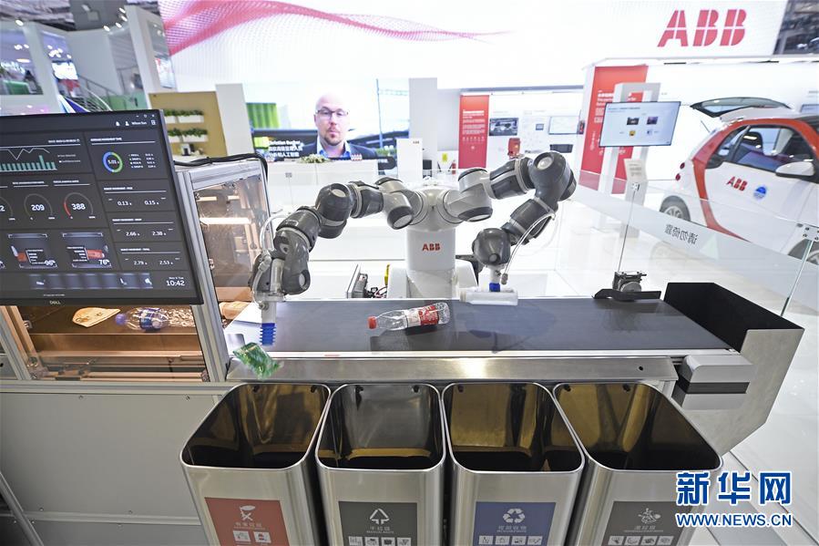 第二屆進(jìn)博會(huì)瑞士ABB集團(tuán)展出的人機(jī)協(xié)作雙臂機(jī)器人YuMi在進(jìn)行垃圾分類(lèi)演示(11月5日攝)。新華社記者王鵬攝