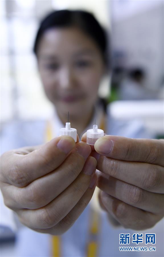 在第二屆進(jìn)博會(huì)醫(yī)療器械及醫(yī)藥保健展區(qū),工作人員展示全球最細(xì)胰島素注射針頭“納諾斯Jr.”(右)與普通針頭的對(duì)比(11月7日攝)。新華社記者王鵬攝