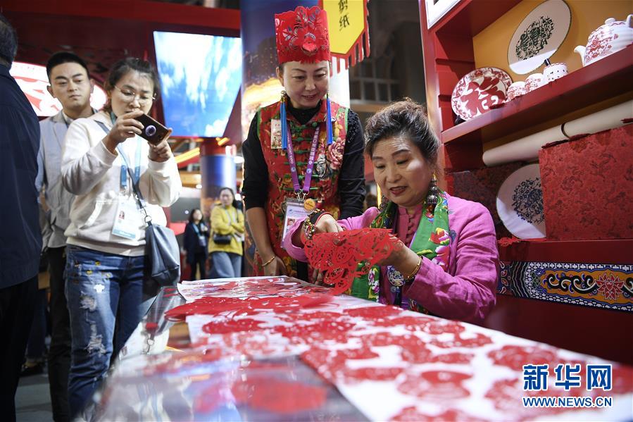 非遺傳承人田亞莉(右一)在第二屆進(jìn)博會(huì)陜西非遺展區(qū)展示剪紙技藝(11月8日攝)。新華社記者王鵬攝