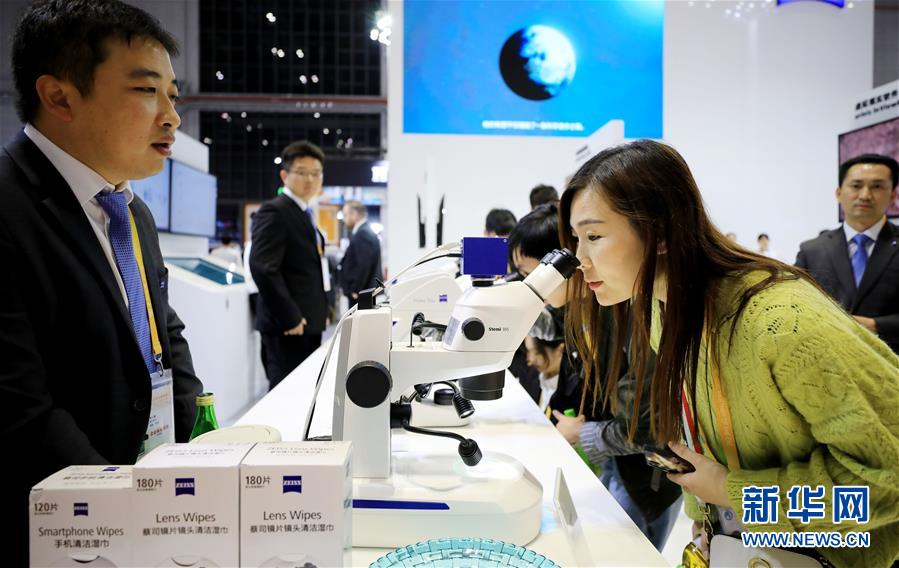 在第二屆進(jìn)博會(huì)裝備展區(qū)德國(guó)蔡司公司展臺(tái),參觀者體驗(yàn)一款數(shù)碼互動(dòng)教學(xué)系統(tǒng)產(chǎn)品(11月8日攝)。新華社記者方喆攝