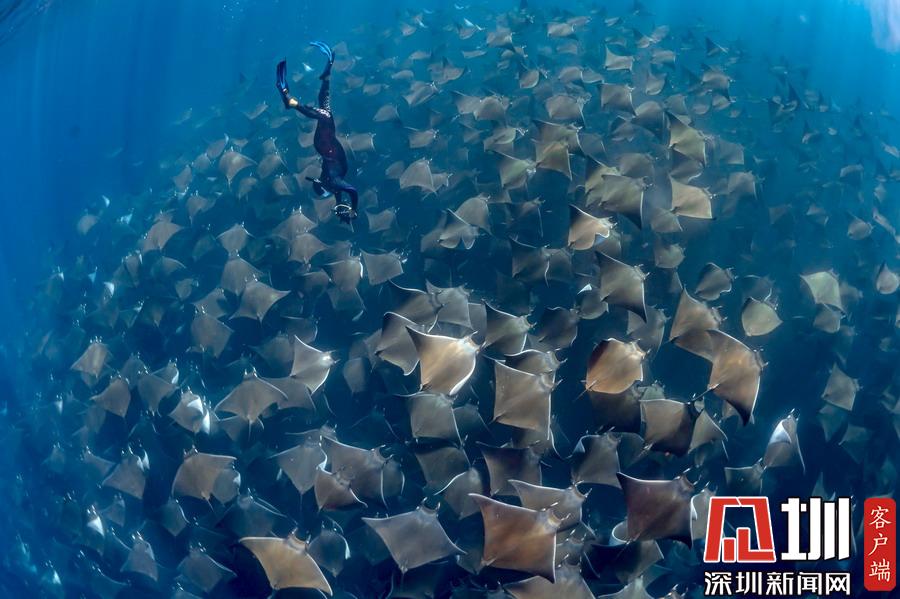 2019年5月31日?qǐng)?bào)道(圖片拍攝于4月23日),環(huán)保活動(dòng)家兼潛水教練Jay Clue上個(gè)月在墨西哥下加利福尼亞州洛斯卡沃斯附近海岸,幸運(yùn)地邂逅了一支蝠鲼遷徙大軍,數(shù)百只蝠鲼浩浩蕩蕩在海水中行進(jìn),畫面十分震撼。