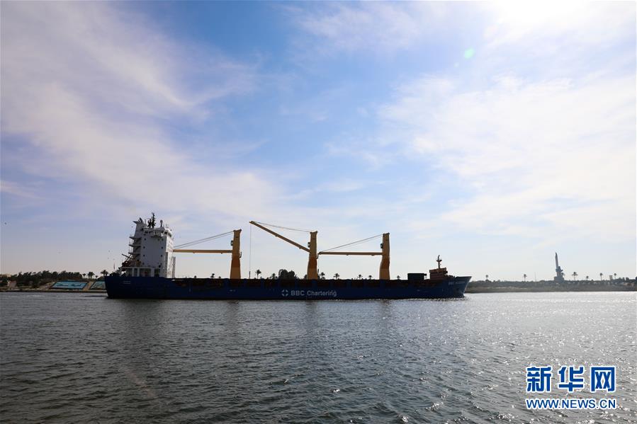 11月17日,在埃及伊斯梅利亞,一艘貨輪從蘇伊士運河上駛過。埃及蘇伊士運河管理局17日在埃及東北部伊斯梅利亞省舉行儀式,慶祝蘇伊士運河通航150周年。新華社記者李碧念攝
