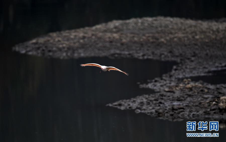 11月19日,朱鹮飛翔在漢江支流的牧馬河畔。  每年冬季,成群結(jié)隊(duì)的朱鹮飛翔在漢江及漢江支流的河灘、濕地,覓食、棲息,成為當(dāng)?shù)匾坏懒聋惖娘L(fēng)景線。  新華社記者陶明攝