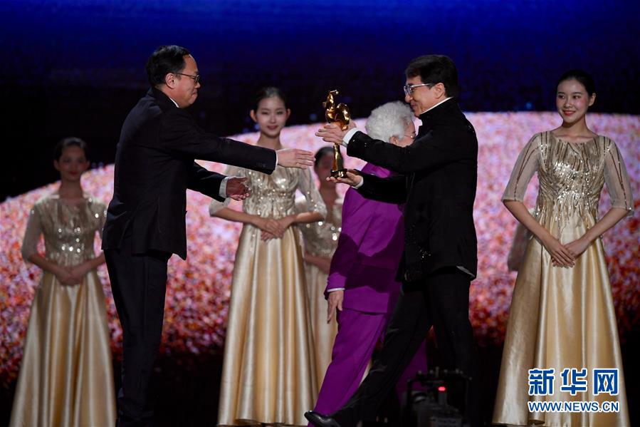 11月23日,電影《流浪地球》獲得最佳故事片獎(jiǎng),成龍?jiān)跒殡娪俺銎贩酱眍C獎(jiǎng)。當(dāng)日,第32屆中國(guó)電影金雞獎(jiǎng)?lì)C獎(jiǎng)典禮在福建廈門(mén)舉行。新華社記者姜克紅攝